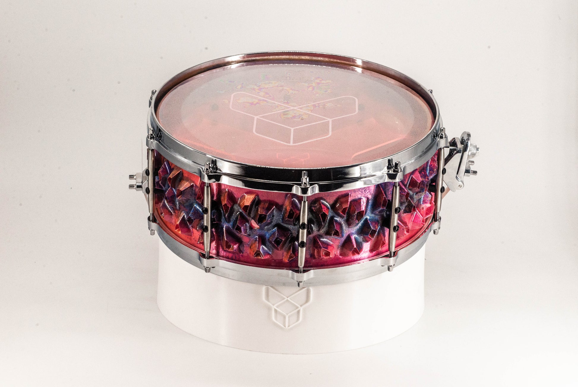 Transform your sound with our revolutionary 3D-printed snare drum, where digital craftsmanship meets acoustic excellence. Our Nucleus snare in red white from our CELLULAR series features our signature textured shell design, post-strengthened for superior durability and resonance.